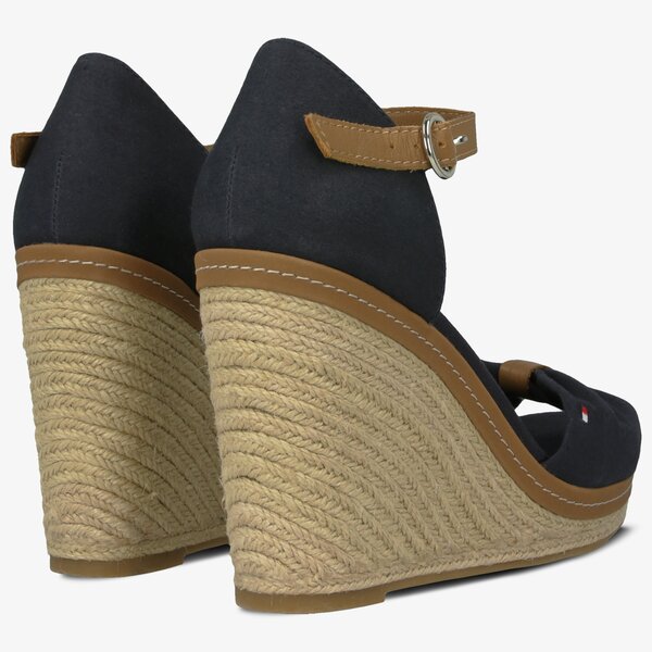 Kwintesencja lata zamknięta w parze butów wygląda właśnie tak, jak one - sandały na koturnach Iconic Elena marki Tommy Hilfiger. Te piękne, granatowe buty osadzono na stabilnym koturnie z dekoracyjną plecionką. Przednią kokardę oraz usztywniany zapiętek wykonano z wytrzymałej bawełny. Kostkę obejmuje pasek z regulacją i klamerką. Komfort noszenia zapewnia materiałowa wyściółka wzmocniona z tyłu wstawką ze skóry. Całość spoczywa na wysokim, stabilnym koturnie. Na boku umieszczono małe logo brandu.